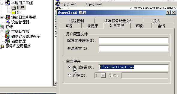 建立帳號,并修改主文件夾路徑為你指定的目錄(指定的目錄必需要有此用戶的"完全控制"訪問權(quán)限,權(quán)限可以在目錄上右擊--->屬性里修改). | |