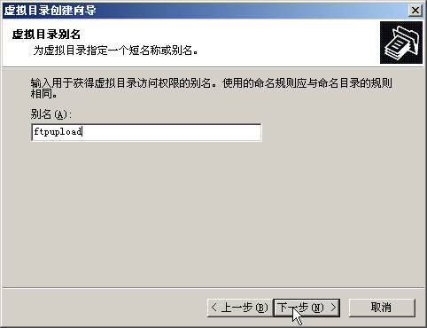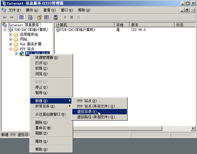 開始--->程序--->管理工具--->IIS信息管理器 打開IIS管理工具.展開FTP站點,在"默認(rèn)FTP站點上右擊--->新建"虛擬目錄" | |