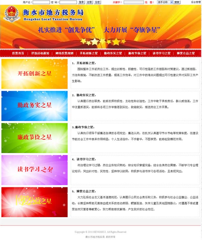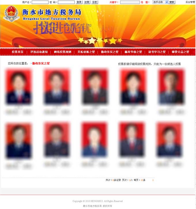 衡水起航網(wǎng)絡(luò)科技有限公司承接了此次人物評(píng)選投票活動(dòng)的網(wǎng)絡(luò)投票程序任務(wù)。經(jīng)過(guò)三個(gè)日夜的緊張測(cè)試,網(wǎng)絡(luò)投票系統(tǒng)已在地稅局內(nèi)網(wǎng)正式上線,投票將于18日上午9:00開始,此次“季度之星”評(píng)選共設(shè)置“開拓創(chuàng)新之星”、“勤政務(wù)實(shí)之星”、“廉政節(jié)儉之星”、“讀書學(xué)習(xí)之星”、“博愛公益之星”五個(gè)類別,每個(gè)類別最終產(chǎn)生“季度之星”1名。